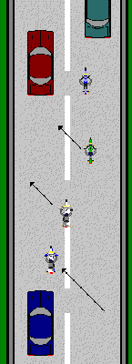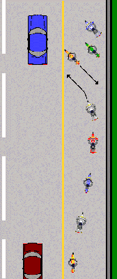 The Advance: As the path clears, riders move one at a time, from the back of the group to the front, transitioning into the new lane and resuming their staggered formation.