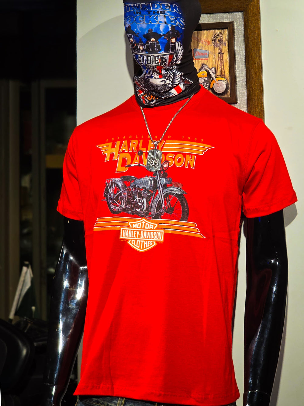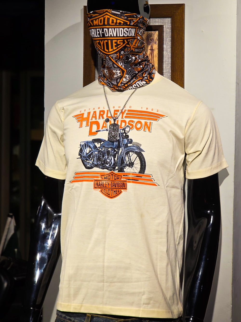 This T-shirt features a vintage motorcycle graphic with bold stripes and classic branding. The layout is straightforward, combining heritage elements with a clean, structured design.