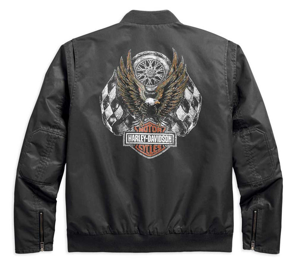 HD Men's Checkered Flag Eagle Bomber Jacket, 97455-18VM. Made from 100% nylon twill with enzyme wash. Printed polyester twill lining. Rib-knit collar and waist. Zipper front and cuffs. Lightly padded elbows. Action back. Two snap flap hand-warmer pockets, two zipper hand-warmer pockets, and one zipper chest pocket. One horizontal interior pocket and one zipper vertical interior pocket. D-ring key fob on right pocket. 97455-18VM
