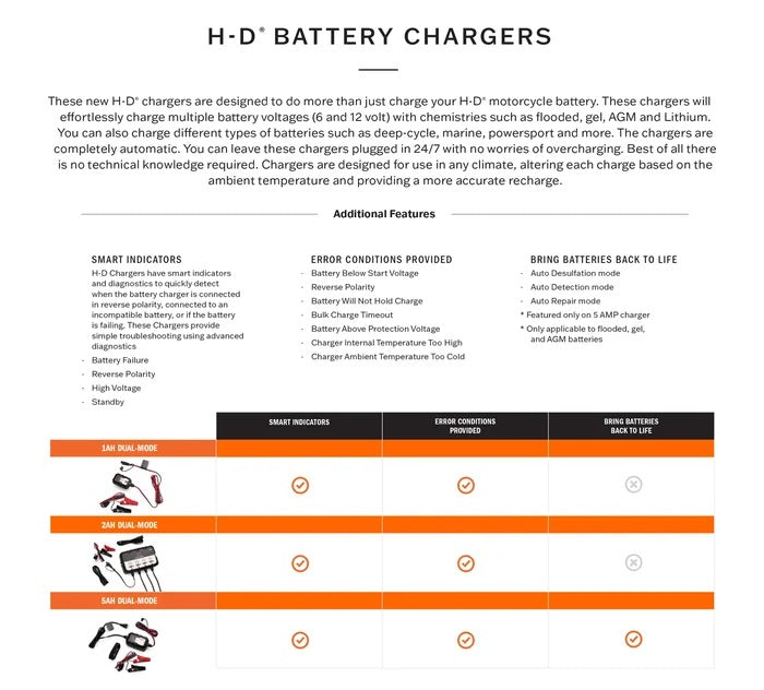 This fully-automatic HD Dual-Mode Battery Charger is ideal for short- or long-term motorcycle battery charging needs. No motorcycle battery charger system offers more value and versatility, backed by a 5-year warranty.
