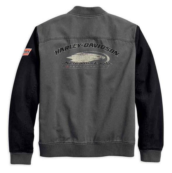 HD Men's Screamin' Eagle Casual Jacket, 97465-18VM. Made from 100% cotton twill with a heavy enzyme wash. Polyester lining. Snap front. Rib-knit collar, cuffs, and waist. Two hand-warmer pockets. Embroidered patches on left sleeve and chest. Distressed printed graphics on right chest and back. Rugged twill is surprisingly soft with a lived-in look (thanks to the distressing effects of the enzyme wash). Rib-knit details lend a bomber jacket feel to this sporty snap-front layer. We finish this men's casual jacket with bold patches and printed graphics inspired by the aggressive look of our iconic Screamin' Eagle.
