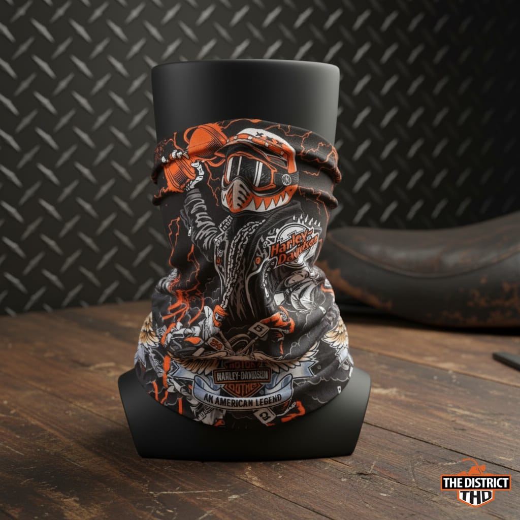 The Trophy Champion bandana features a central trophy graphic with classic text and checker detailing. The design is bold and symmetrical, combining cruising-inspired elements with a clean layout.