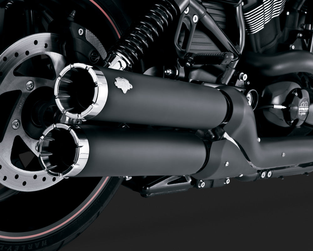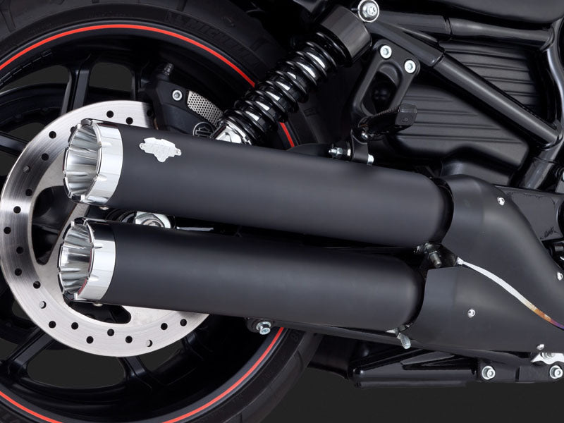 These mufflers feature a race-quality black ceramic coating complemented by machined billet end caps and a riveted chrome Vance & Hines badge, embodying the brand's signature Black Line aesthetic.